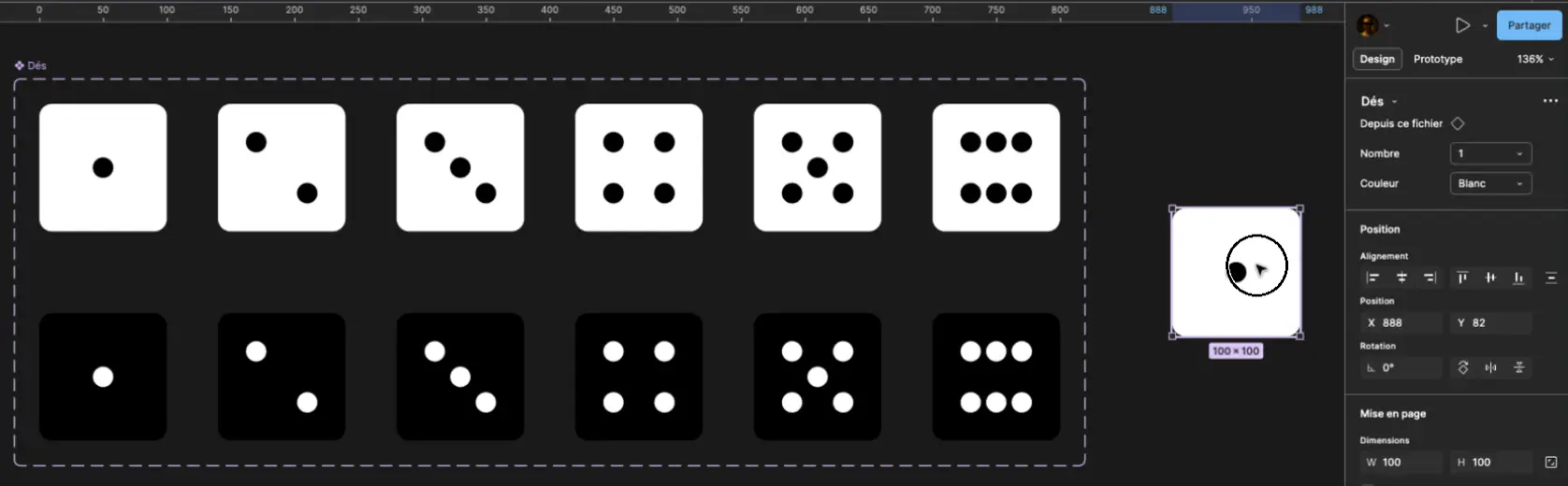 Le but de cet exercice est de créer des variantes de composantes afin d'obtenir la possibilité de créer une instance de dé à 6 faces qu'on peut configurer en noir ou en blanc.