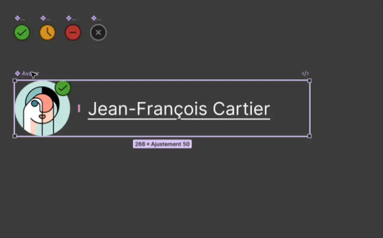 Vous allez créer une composante « avatar » composée d'une image de profil, d'un indicateur d'état et d'un nom complet.
