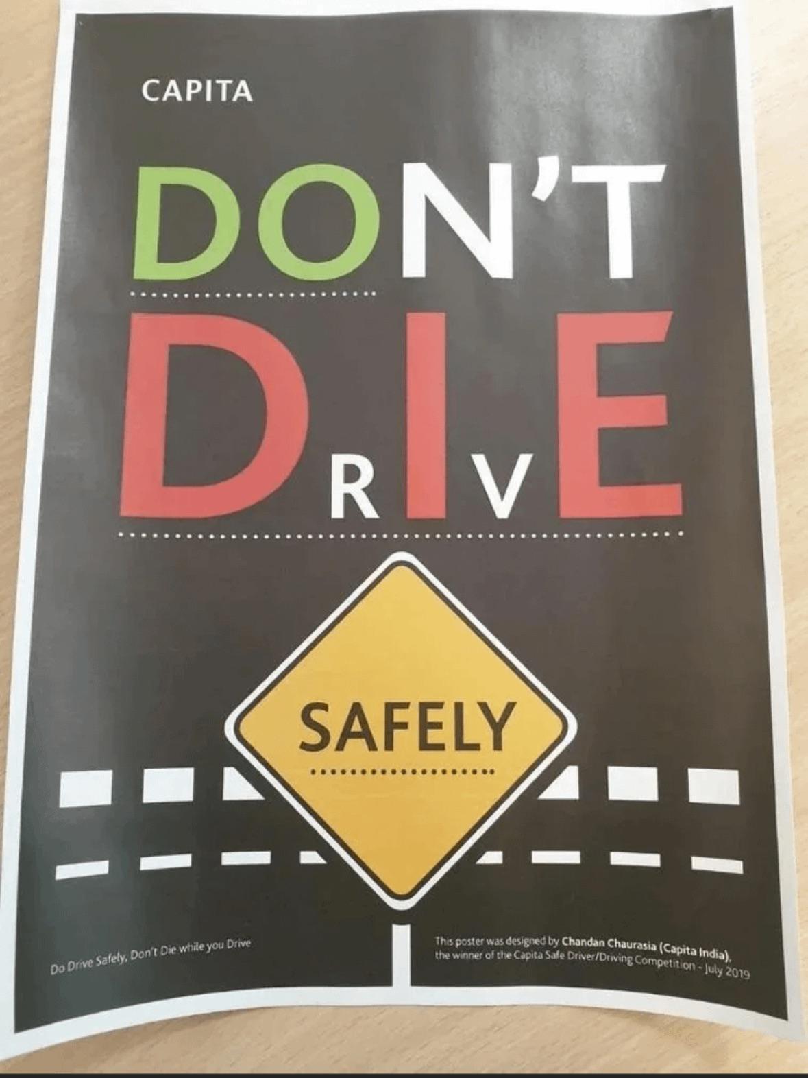 This poster was designed by Chandan Chaurasia (Capita India), the winner of the Capita Safe Driver/Driving Competition - July 2019