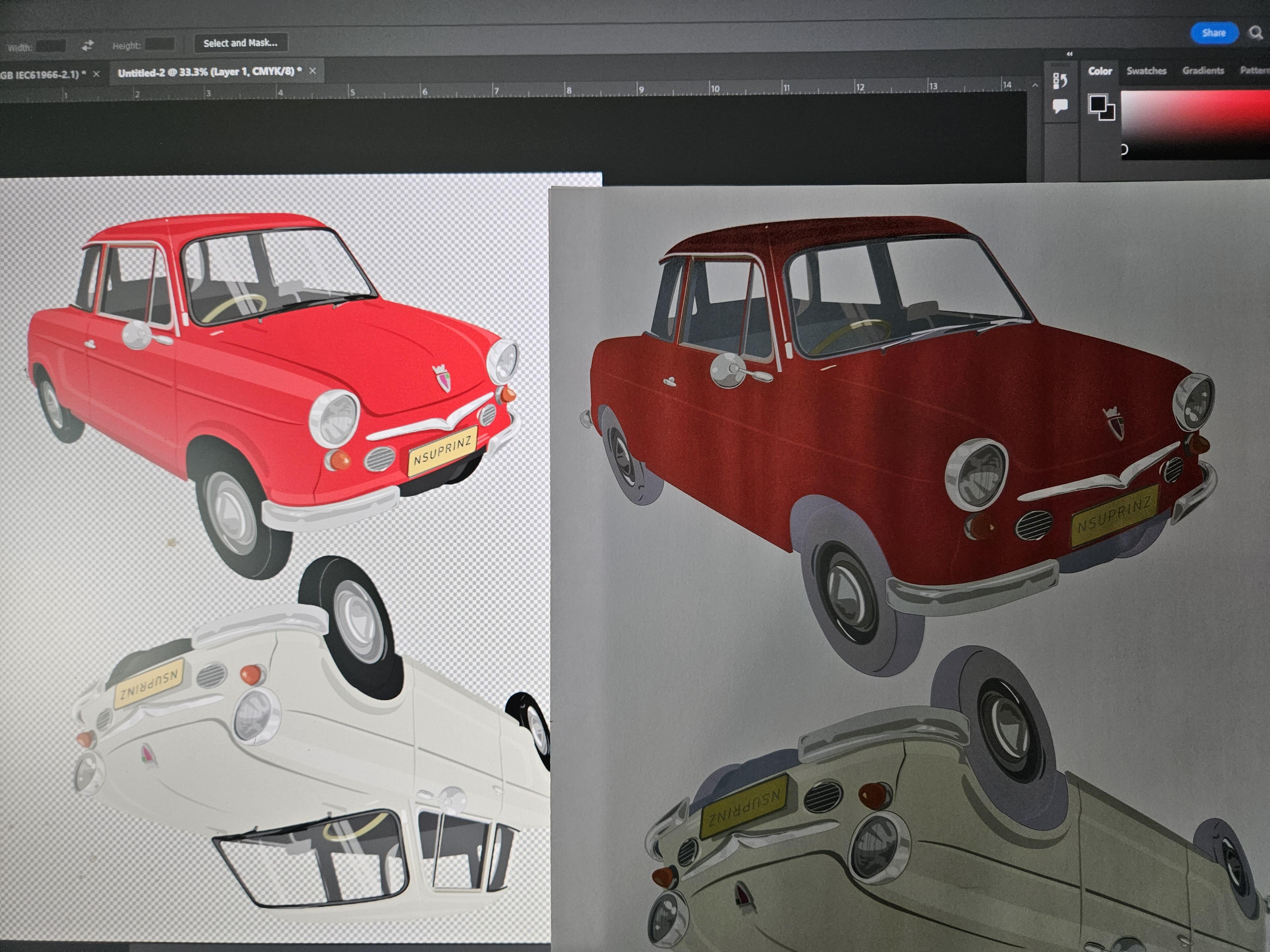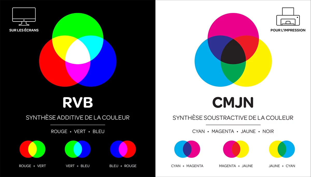 L’espace colorimétrique RGB est plus large que CMYK. Certaines couleurs très vives visibles à l’écran ne peuvent donc pas être reproduites exactement à l’impression.