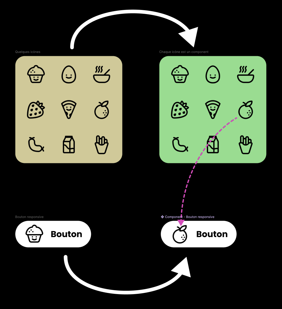 Pour créer une composante, sélectionner un ou plusieurs éléments puis Ctrl+Alt+K (Windows) ou Cmd+Option+K (Mac).