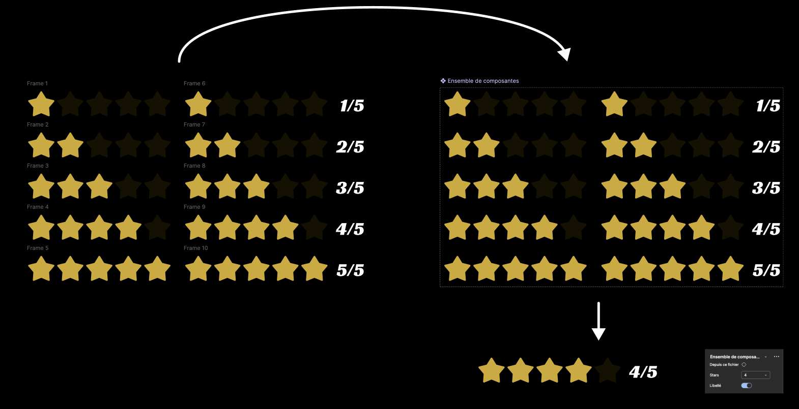 Les variantes permettent de regrouper plusieurs états d'un même composant. Par exemple, un bouton avec ses 5 états (Default, Hover, Active, Focused, Disabled) est un seul composant avec 5 variantes.
