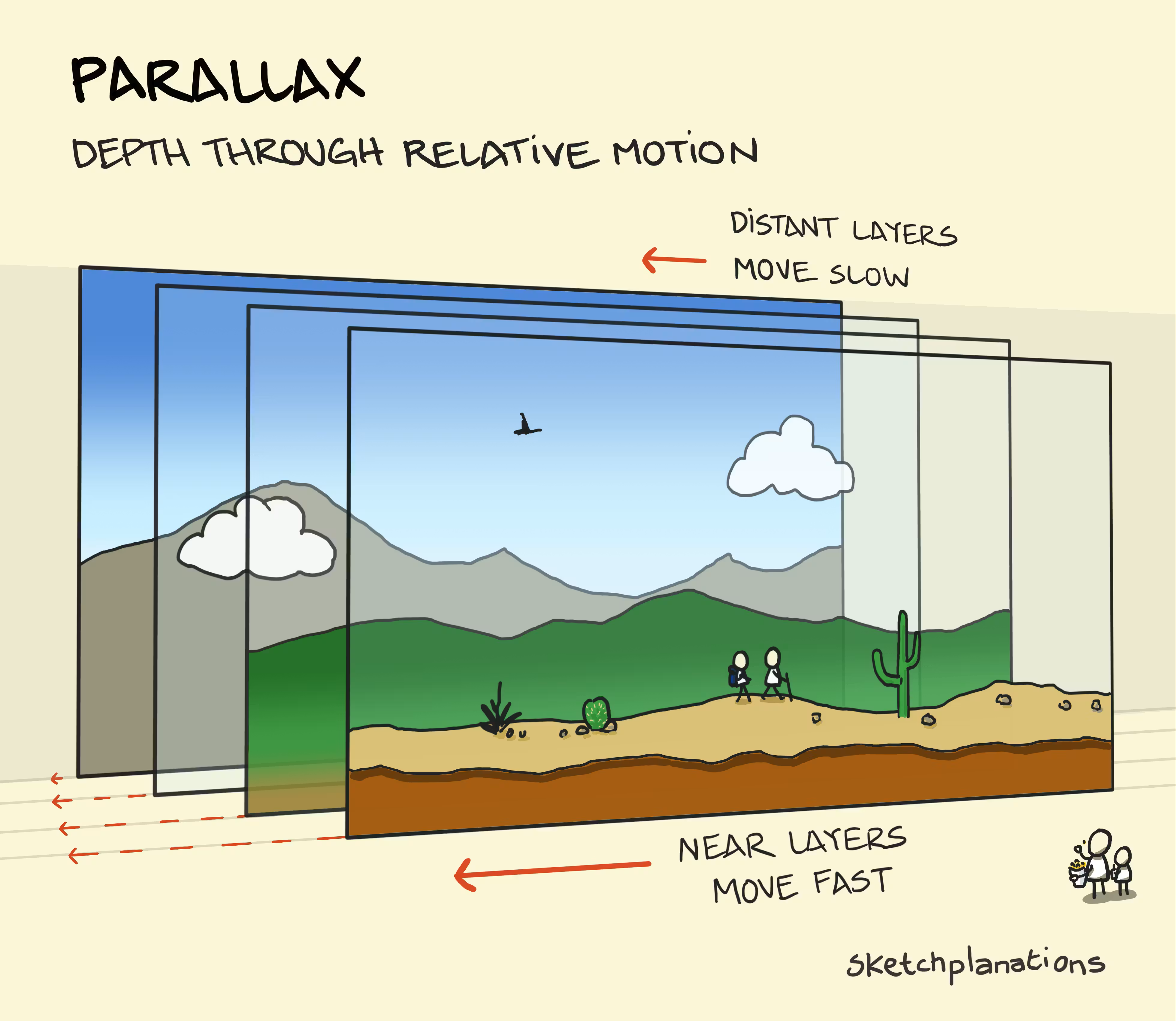 La parallaxe c'est le décalage d'un objet par rapport à un autre lorsque l'observateur change de point de vue. En vidéo, on voit les objets proches bouger plus vite et les objets loin bouger plus lentement. Sans parallaxe, une image est plate comme un dessin : exemple. Néanmoins, il est possible de créer un effet de parallaxe pour donner vie à nos images dans After Effects. Pour y arriver, il est nécessaire de disposer des calques en relation de distance et d'animer une caméra. Pour se pratiquer, nos allons faire un exercice simple.