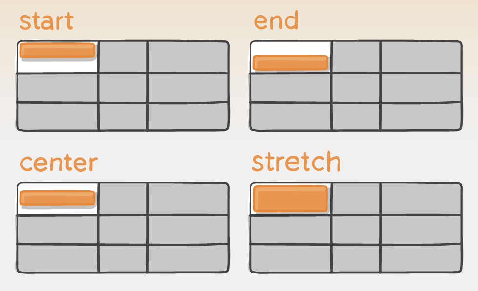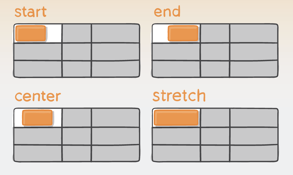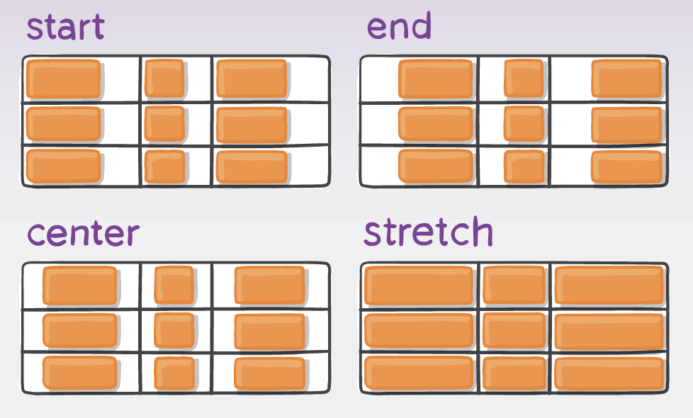 s'applique au conteneur de la grille et définit l'alignement par défaut pour tous les items. Les propriétés individuelles align-self