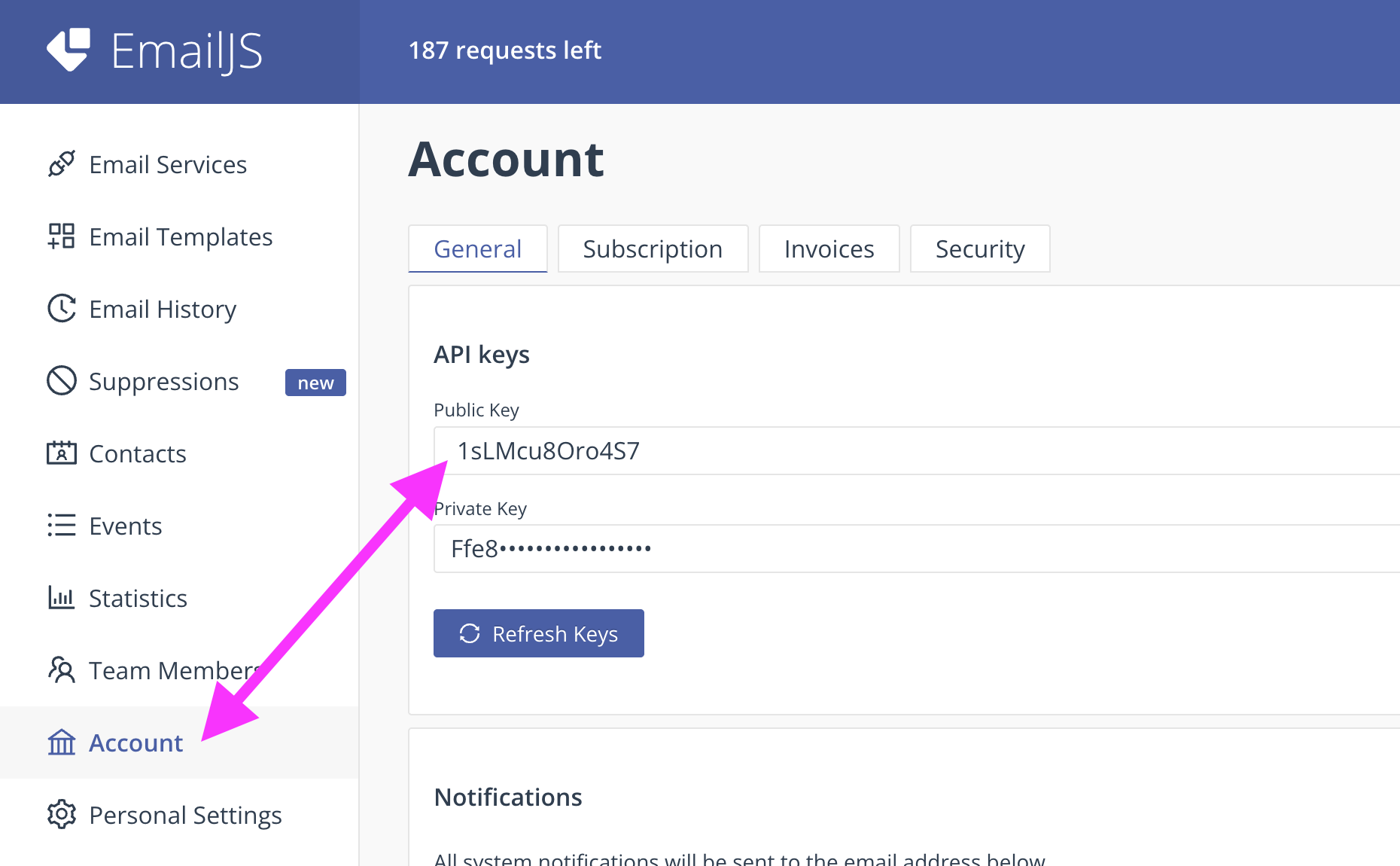 La clé publique de votre compte se trouve dans l'onglet Account