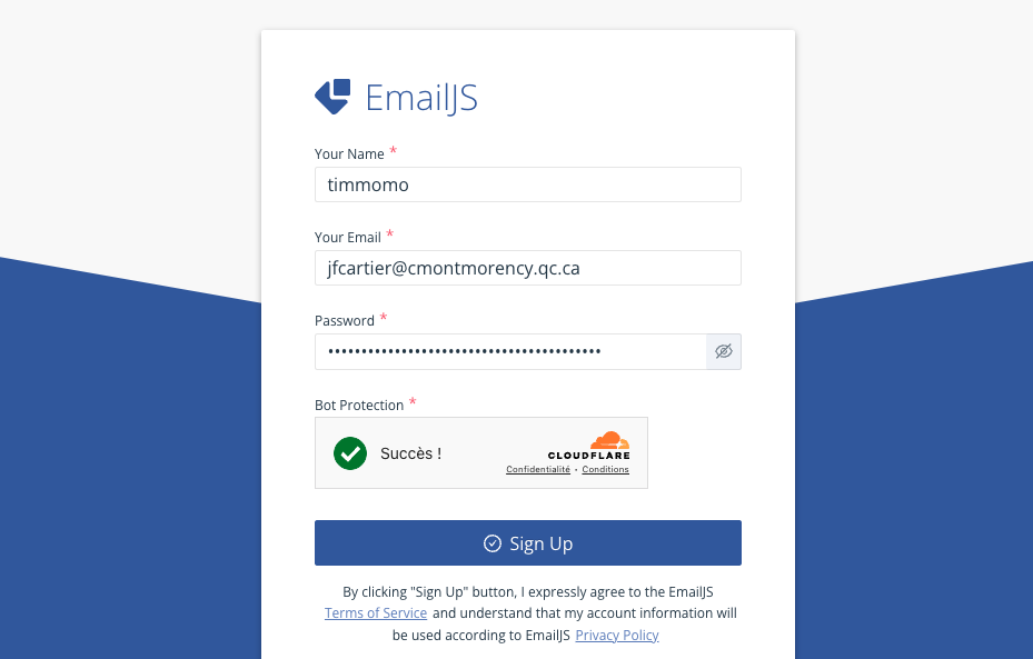 Créer un compte avec les informations de connexion de votre choix à l'adresse suivante : https://dashboard.emailjs.com/sign-up