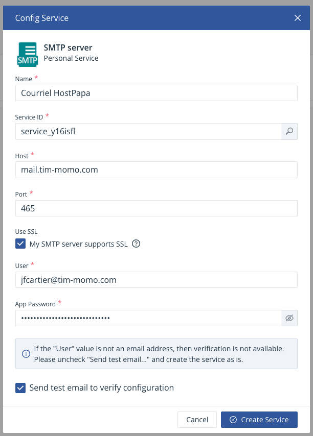 - Pour le App Password, utiliser le courriel de votre courriel créé sur cPanel.