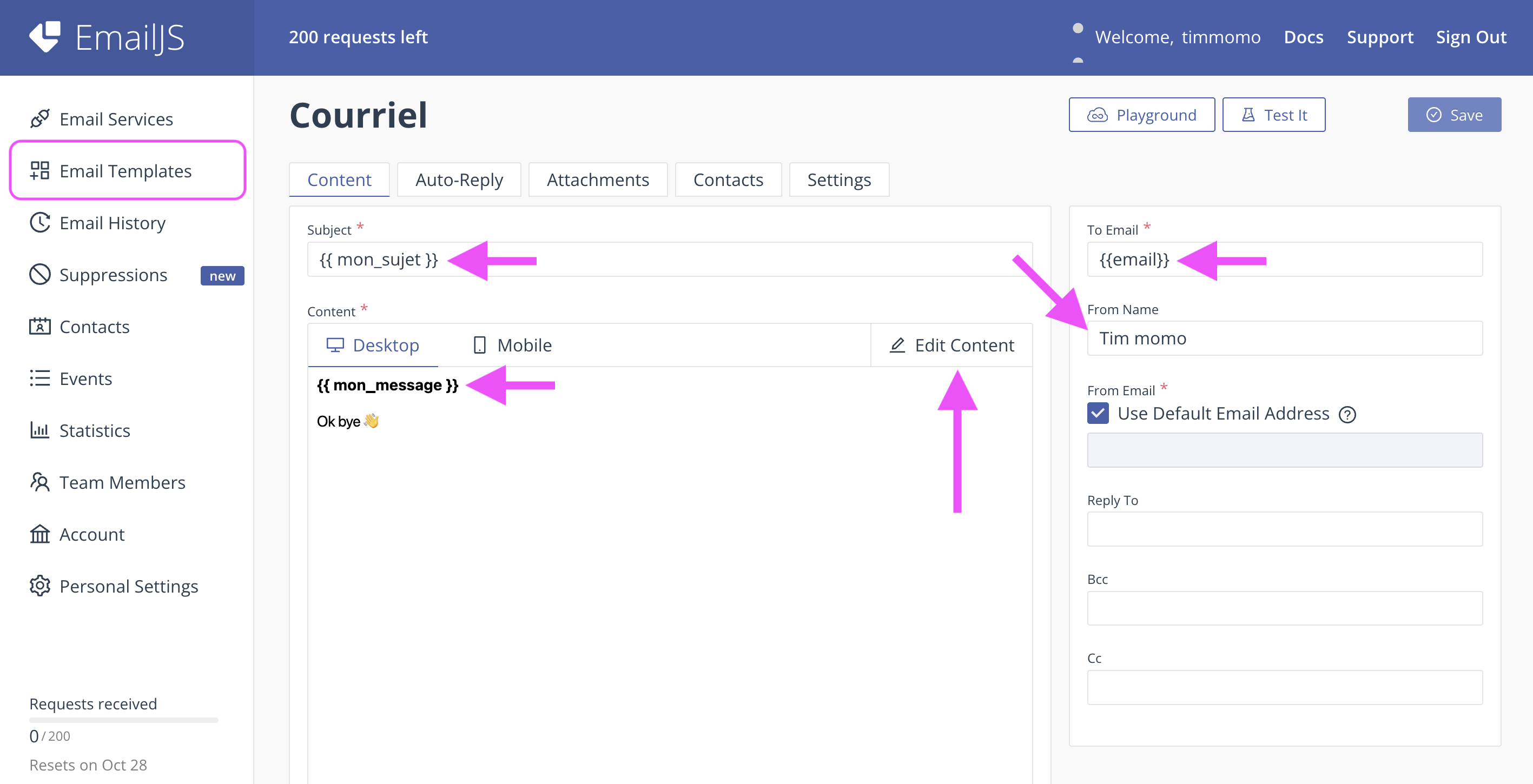 - Dans le champ Subject, on peut ajouter une variable « {{mon_sujet}} »