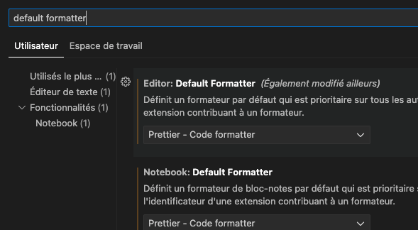 - Recherchez « Default Formatter »