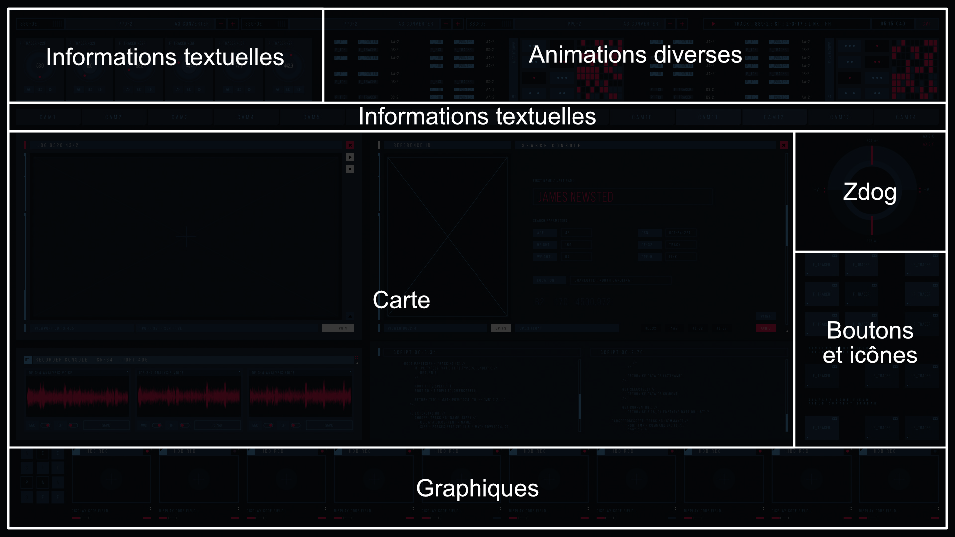 Interface futuriste animée, interactive, complexe et attrayante. Aussi appelée HUD.