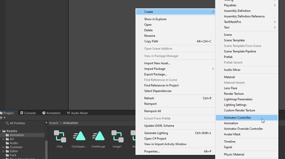 - Ensuite, faites un clic droit dans cette fenêtre, puis choisissez Create, Animator Controller. Vous pouvez aussi aller dans la barre de Menu et faire Assets, Create, Animator Controller.