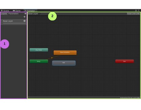 Cette fenêtre permet de visualiser les animations qui ont déjà été créées. Les animations sont affichées en gris, sauf une qui est orange. L'animation qui est orange est celle qui sera appliqué par défaut sur votre objet. Les boîtes Entry, Any State et Exit nous permettent d'animer les transitions à des moments clés. Dans cette fenêtre, les flèches représentent les transitions.