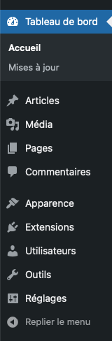 - Mises à jour : mises à jour de WordPress, thèmes, extensions et traductions.