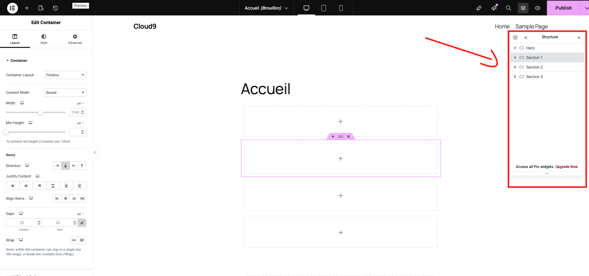 Le panneau Structure permet de voir l’organisation de tous les conteneurs et éléments.
